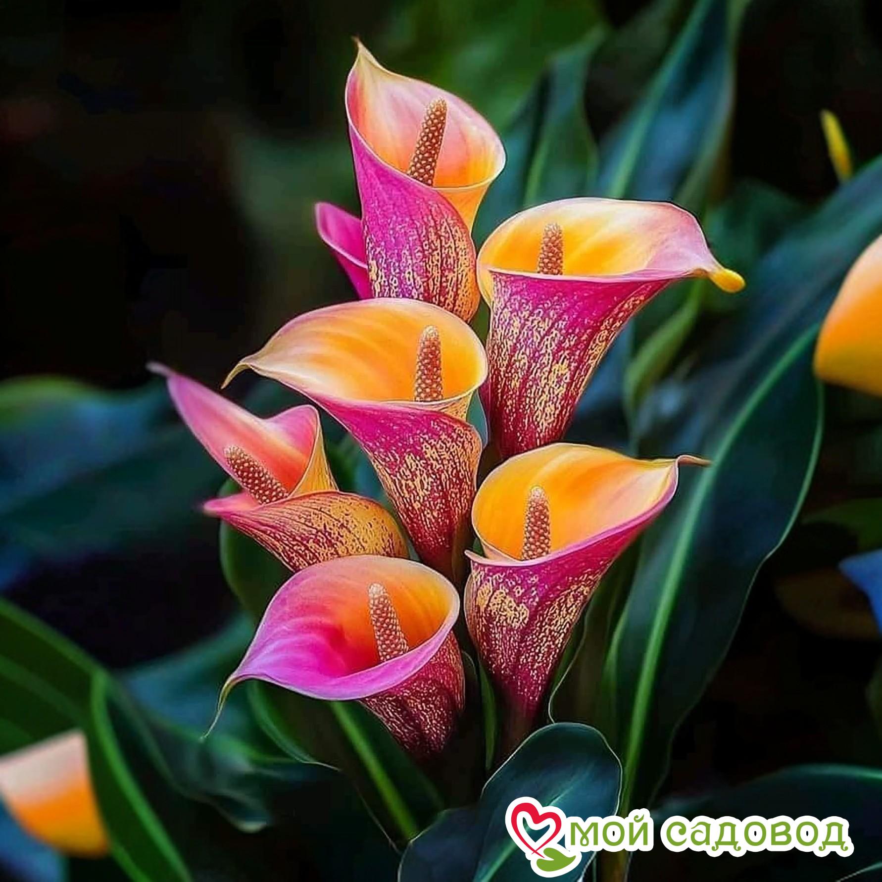 Калла (Zantedeschia) — элегантное и изысканное растение, которое часто ассоциируется с чистотой, нежностью и красотой. Хотя каллу часто называют цветком, на самом деле ее привлекательность обусловлена видоизмененным листом, называемым покрывалом (spathe), которое окружает центральный початок (spadix) с мелкими невзрачными цветками. Покрывало, как правило, имеет воронкообразную форму и может быть разных цветов: классического белого, кремового, желтого, розового, красного, бордового и даже почти черного. Каллы родом из Южной Африки, где они растут в болотистой местности. В зависимости от вида каллы могут быть многолетними клубневыми или корневищными растениями. Клубневые каллы, как правило, цветут весной и в начале лета, а корневищные — летом и осенью. Листья у калл стреловидные или копьевидные, часто с белыми или серебристыми пятнами. Каллы — универсальные растения, которые можно выращивать как в саду, так и в качестве комнатных растений. В саду они предпочитают влажные, хорошо дренированные почвы и полутень. Комнатные каллы требуют яркого, но рассеянного света и регулярного полива. Важно избегать переувлажнения, так как это может привести к гниению клубней или корневищ. Благодаря своей элегантности и разнообразию цветов каллы широко используются во флористике. Они популярны в свадебных букетах, композициях и других торжественных мероприятиях. Каллы также хорошо смотрятся в одиночных вазах, где они могут продемонстрировать свою утончённую красоту. Они символизируют восхищение, благодарность и уважение, что делает их прекрасным подарком на любой случай. Виды и сорта: Существует множество видов и сортов калл, различающихся по высоте, цвету и форме покрывала. Zantedeschia aethiopica (белокрыльник эфиопский) — наиболее распространённый вид, достигающий в высоту 1 метра. Он отличается крупными белыми покрывалами и часто выращивается как садовое растение. К другим популярным видам и сортам относятся: Zantedeschia rehmannii (белокрыльник розовый) с розовыми или красными покрывалами; Zantedeschia elliottiana (белокрыльник жёлтый) с ярко-жёлтыми покрывалами; а также гибридные сорта с самыми разнообразными оттенками и размерами. Уход: Каллы нуждаются в регулярном поливе, особенно в период активного роста и цветения. Подкормку следует проводить комплексными удобрениями для цветущих растений каждые 2–3 недели. После цветения полив следует постепенно сокращать, а клубневые каллы можно выкопать и хранить в сухом прохладном месте до следующей весны. Зимой комнатные каллы нуждаются в периоде покоя, поэтому полив следует значительно сократить и перенести растение в более прохладное место. Важно следить за влажностью воздуха, особенно в отапливаемых помещениях, и при необходимости опрыскивать листья водой. Размножение: Каллы размножают делением клубней или корневищ, а также семенами. Деление клубней или корневищ лучше всего проводить весной, перед посадкой. Семена можно высевать весной в хорошо дренированную почву. Проблемы: Каллы могут подвергаться атакам тли, паутинного клеща и других вредителей. Регулярный осмотр растений и своевременная обработка инсектицидами помогут предотвратить распространение вредителей. Кроме того, переувлажнение почвы может привести к гниению корней и клубней, поэтому важно обеспечить хороший дренаж. Каллы — это не только красивые, но и д